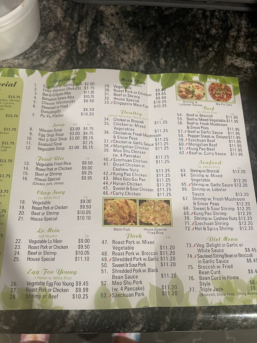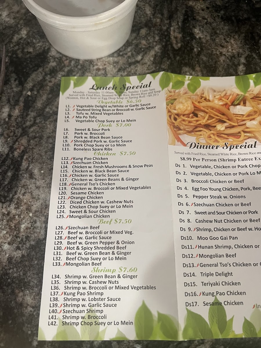 - Dinner Specials - Beef: Consists of beef dishes like Beef with Broccoli, Mongolian Beef, Szechuan Beef, Beef with Garlic Sauce, Beef with Snow Peas, Pepper Steak with Onions, Beef with Mixed Vegetables, Beef with Curry Sauce, and Kung Pao Beef. These items combine beef with a variety of vegetables and sauces to cater to varied preferences.