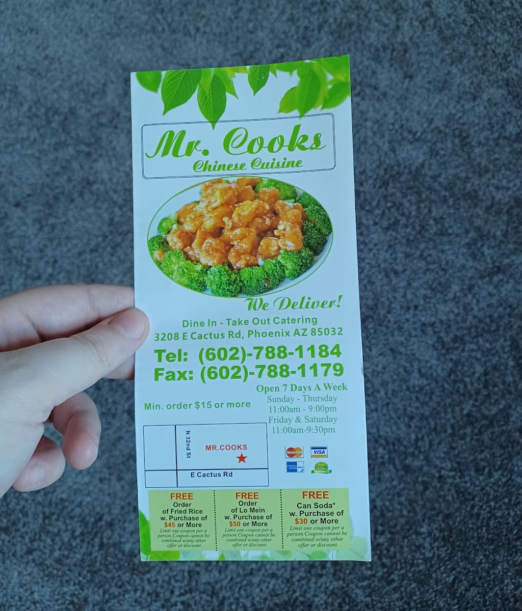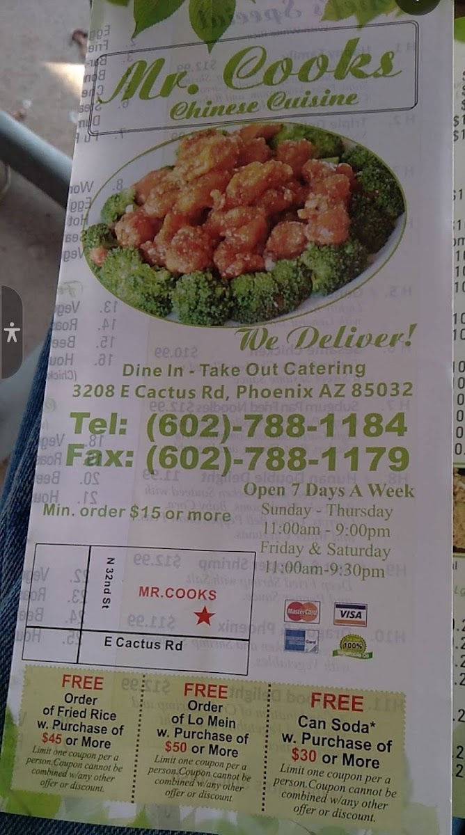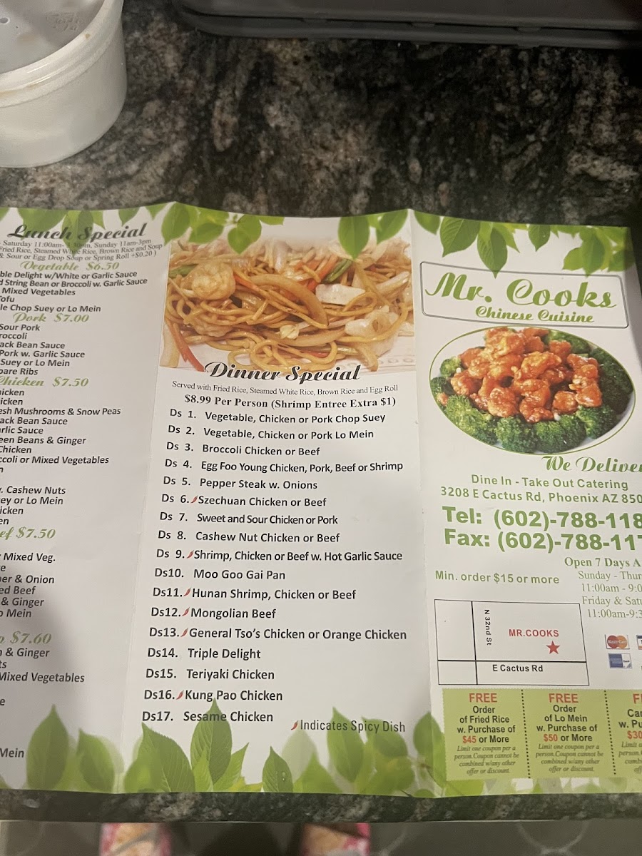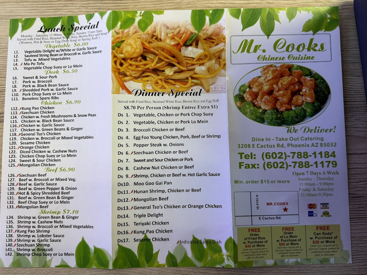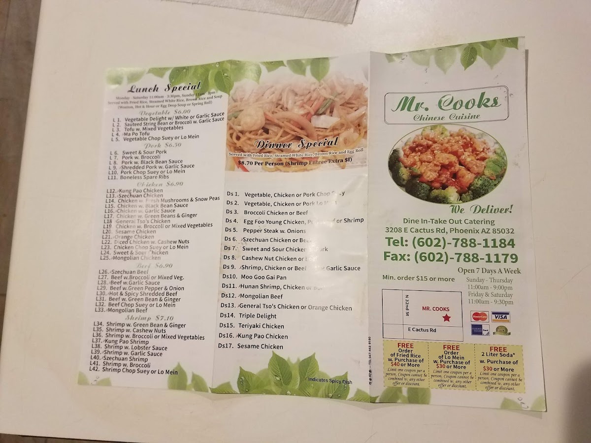 The menu at Mr Cooks offers a range of Chinese and fast food options, suitable for lunch and dinner. It includes multiple categories focused on a variety of meat and seafood dishes, accompanied by traditional sides and rice. The menu is designed to accommodate both dine-in and meal delivery services.