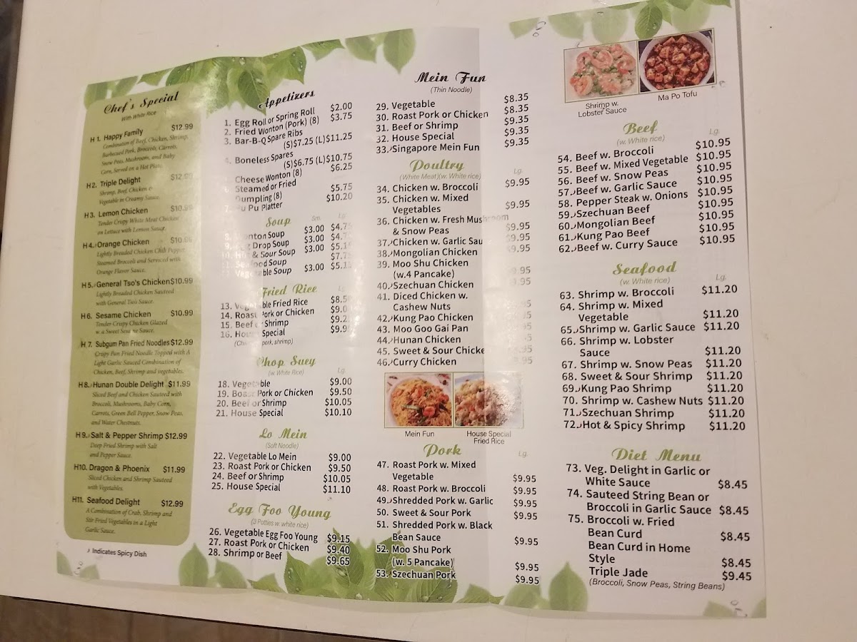 - Dinner Specials - Chef Special: This section features signature dishes such as General Tso's Chicken, Sesame Chicken, Orange Chicken, Happy Family Special, Seafood Delight, Lemon Chicken, Subgum PanFried Noodles, Dragon and Phoenix, Hunan Double Delight, Salt and Pepper Shrimp, and Triple Delight. These options typically include a main protein with vegetables and rice or noodles.
